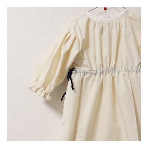 襟ぐりにギャザーを寄せ、さらにウエストを絞れるようにしています。